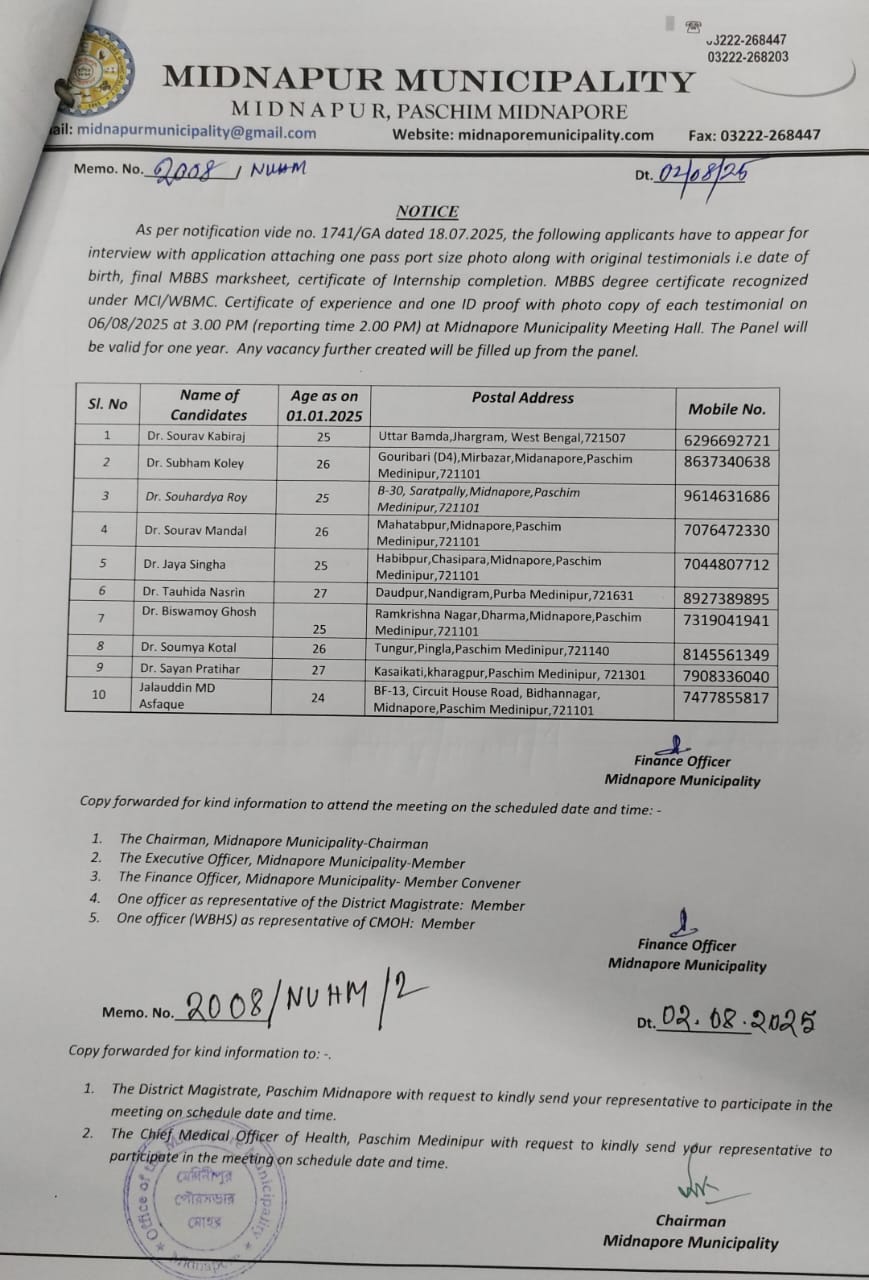 As per notification vide no. 1741/GA dated 18.07.2025, the following applicants have to appear for interview with application attaching one pass port size photo along with original testimonials ie date of birth, final MBBS marksheet, certificate of Intern